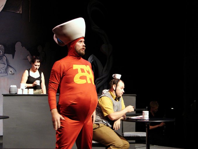 À la base, Too Much Coffee Man est un comic strip de Shannon Wheeler. Le héros est un homme rondouillard accroc au café, qui porte une tasse géante sur la tête et qui philosophe sur l’état du monde. Après une apparition dans une publicité pour la marque de chaussures Converse, le personnage est adapté dans un opéra en un acte, subtilement intitulé « Too Much Coffee Man Opera ».