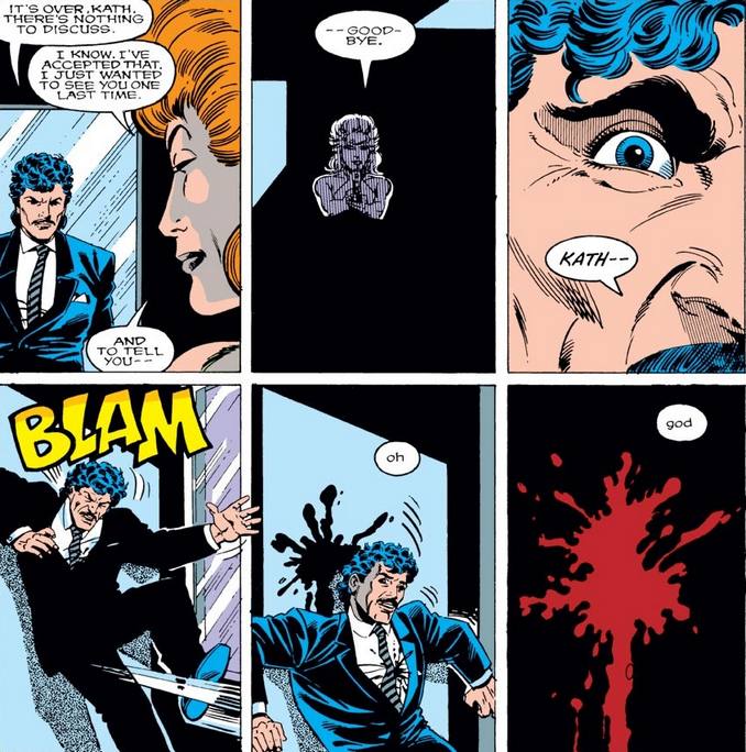 Contrairement à Bruce Wayne, Tony Stark ne simule pas son comportement de playboy. Mais sa vie amoureuse finit par virer au drame lorsqu’il rencontre Kathleen Dare lors d’un gala de charité. Stark tombe sous le charme de l’extravagante jeune femme et James Rhodes la découvre au saut du lit auprès de Tony. Mais elle montre également un côté jaloux et possessif. Lors d’un rally, sa jalousie la pousse à renverser un bac de glaçon sur la tête d’une femme qui avait embrassé Tony Stark. Kathy continue d’agacer Tony lorsqu’elle utilise un canal prioritaire pour lui demander son avis sur une robe. Stark finit par rompre lorsque Kathy Dare le suit en Italie, puis tente de s’infiltrer au sein de son entreprise. Lorsqu’au retour d’une mission en tant qu’Iron Man, Stark découvre Kathy chez lui, il pense que c’est encore une tentative pour renouer avec lui. Erreur : Kathy Dare l’attend une arme à la main et lui tire dessus. Un geste qui a de lourdes conséquences : cette balle prive Tony Stark de l’usage de ses jambes. Après un procès qui prouve que Kathy Dare a des antécédents de violence, la jeune femme est internée. Elle fait son retour bien plus tard, lors de la mort apparente de Stark. Peu après les funérailles, Kathy se tire une balle dans la tête.