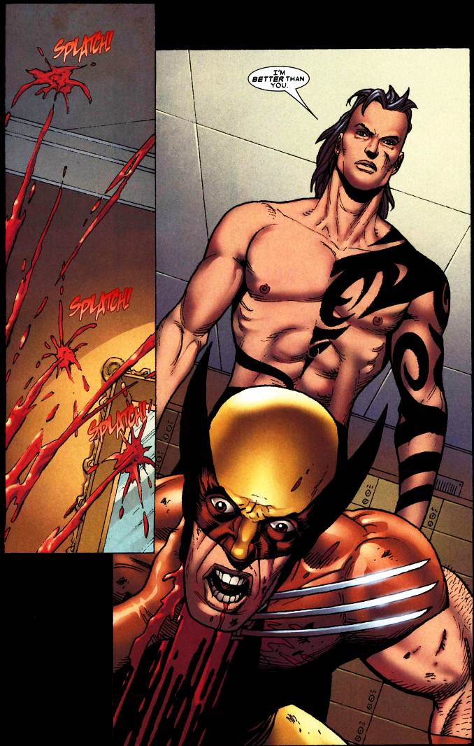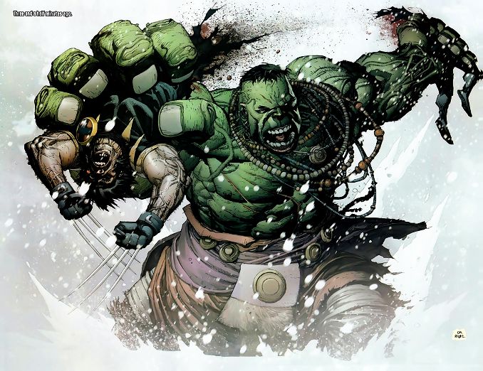 Wolverine est apparu pour la 1re fois dans les pages d’Incredible Hulk, alors que le géant vert affrontait Wendigo. Cependant, Logan n’a jamais vraiment été en mesure de battre Hulk, qui est littéralement infiniment plus puissant que lui. Puis vient l’univers Ultimate. Dans ce monde censément plus réaliste, les failles des héros sont exagérées. Logan tente de tuer Cyclope afin de coucher avec Jean Grey, le Hulk est un monstre cannibale. Plus réaliste, on vous dit ! Merci Mark Millar pour cette relecture… toute en finesse. Bref, ces versions de Wolverine et de Hulk finissent par s’affronter dans la série Ultimate Wolverine vs Hulk. Le SHIELD missionne Wolverine pour retrouver et tuer le monstre. Il le traque jusqu’au Tibet. Wolverine est surpris de trouver un Hulk serein. Cependant, le ton monte vite et Hulk attaque Logan. Le combat lui-même est finalement très rapide. Après plusieurs coups puissants, Hulk attrape le mutant et déchire le corps de Wolverine avant de lancer la partie basse dans une montagne avoisinante… Gore !