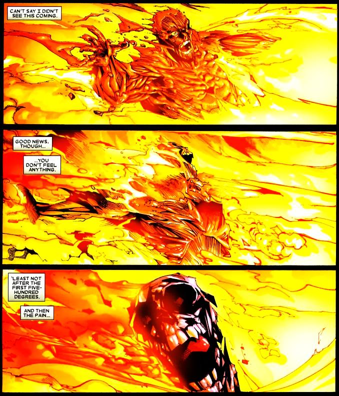 Petit rappel sur le comics Civil War. Si vous ne connaissez que la version cinéma, les circonstances qui lance la guerre entre héros sont différentes. Dans le cadre d’une émission de téléréalité, une équipe de jeunes superhéros s’attaque à des criminels en planque dans la ville de Stanford. Parmis ces supervilains se trouve Nitro, un homme capable de générer des explosions. La ville est détruite et le gouvernement américain passe une loi pour régulariser la situation des superhéros et enregistrer leur véritable identité civile. Alors que Captain America et Iron Man choisissent leur camp, Logan décide de partir en chasse de Nitro. Il lui faut peu de temps pour retrouver ce dernier. A l’approche de Wolverine, Nitro fait détoner son corps. La déflagration réduit le héros à l’état de squelette. Fort heureusement, son facteur autoguérisseur est si puissant qu’il parvient à se régénérer et à stopper le supervilain.