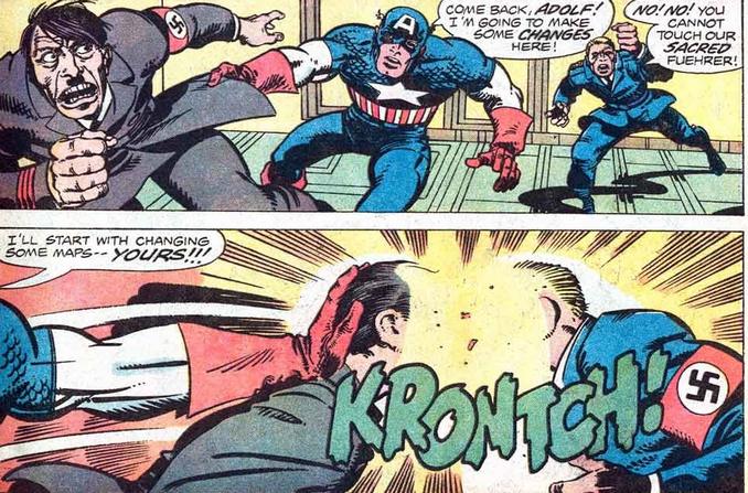 Si je vous parle de Captain America frappant Adolf Hitler, vous penserez forcément à la couverture de Captain America Comics n°1. Pourtant, Steve Rogers ne croise pas le dictateur dans ce numéro. Je choisis donc de vous parler de Captain America : Bicentennial Battles, un one-shot sorti en 1976 pour le 200e anniversaire de la création des Etats-Unis d’Amérique. L’un des Doyens de l’univers. Mister Buda, également connu sous le nom du Contemplateur, veut donner à Captain America un aperçu de l’histoire de son pays. Il le renvoie ainsi dans le passé, avec un 1er arrêt durant la 2de Guerre Mondiale. Steve Rogers se retrouve face à Hitler, qui torture le jeune Bucky ! Il passe immédiatement à l’action, évitant une attaque de Crâne Rouge au passage. Captain America saisit Hitler et neutralise l’un de ses lieutenants en frappant leurs têtes l’une contre l’autre !