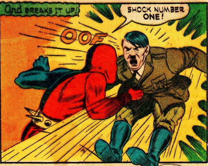 Le nom vous a peut-être induit en erreur. Bien avant la création de Matt Murdock, Daredevil est un héros de l’âge d’or apparu en 1940. Ce héros armé de boomerangs apparaît dans Silver Streak avant d’avoir son propre comics. Daredevil n°1 annonce la couleur dès la couverture, qui s’intitule Daredevil battles Hitler ! Le numéro tient ses promesses : le héros suit le dictateur en Afrique pour le combattre ! Daredevil entame les hostilités d’un coup de poing au ventre. L’un de ses alliés, un archer, emporte d’une flèche la moustache d’Adolf. Lorsqu’Hitler se réfugie dans un char, Daredevil l’en arrache avant de lui coller un uppercut au menton. Le nazi part sur un toit mais Daredevil le fait chuter avec son boomerang. Adolf Hitler finit par fuir l’Afrique pour repartir en Allemagne !
