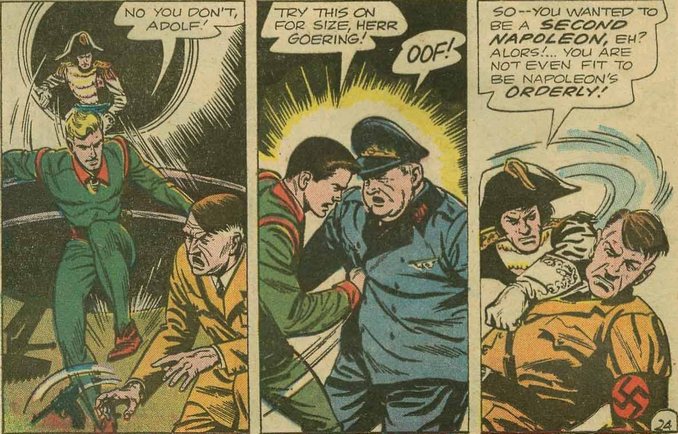 Dans Rip Hunter n°20, le voyageur temporel Rip Hunter se rend dans le Berlin de la 2de Guerre Mondiale afin de filmer des vidéos pour les historiens de son époque. Mais les troupes antiaériennes allemandes abattent sa bulle temporelle. Les nazis capturent Rip Hunter et ses amis. Les allemands connaissent la nature de l’appareil, Rip Hunter ayant déjà visité cette époque. Adolf Hitler lui pose donc un ultimatum. Il fera abattre les compagnons de Rip si ce dernier ne lui amène pas un génie militaire capable de faire pencher la balance en sa faveur. Hitler ordonne donc au héros de lui ramener Napoléon Bonaparte ! Rip Hunter part pour les Tuileries en 1815, mais tombe sur les Prussiens. A nouveau capturé par les Allemands de l’époque, il parvient cependant à s’échapper en emmenant avec lui l’empereur déchu, Napoléon. Par gratitude, Napoléon accepte de suivre les indications de Rip Hunter. Bonaparte conduit les troupes nazies dans un piège. Rip Hunter et Napoléon font ensuite équipe pour libérer les amis du voyageur temporel. D’un coup de pied, Rip Hunter arrache le pistolet que tient Hitler, tandis que Napoléon frappe l’apprenti dictateur au menton ! ■