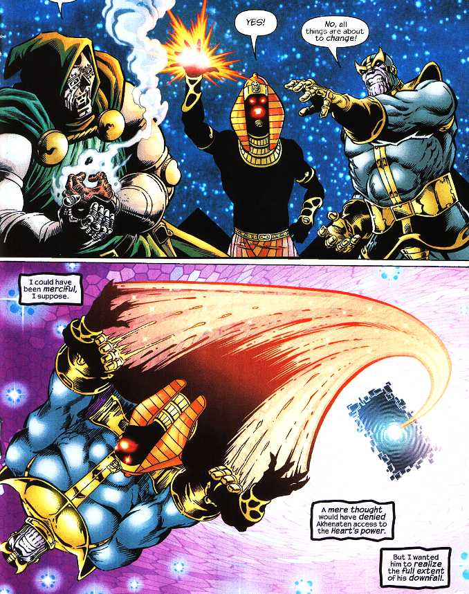 Non, le chanteur d’IAM ne s’en est pas pris à Thanos ! Dans Marvel : La Fin, Akhenaton est un pharaon touché par une énergie cosmique et revient sur Terre après des siècles d’absence. Corrompu par sa puissance, Akhenaton entend réinstaller un ordre martial et tue la majorité des héros. Thanos ne peut rien pour les sauver, et doit admettre sa défaite en essayant de… remonter dans le temps, pour empêcher cela. Il y parvient, mais uniquement après un 1er échec inaugural. Une astuce qui pourrait inspirer Avengers : Endgame.