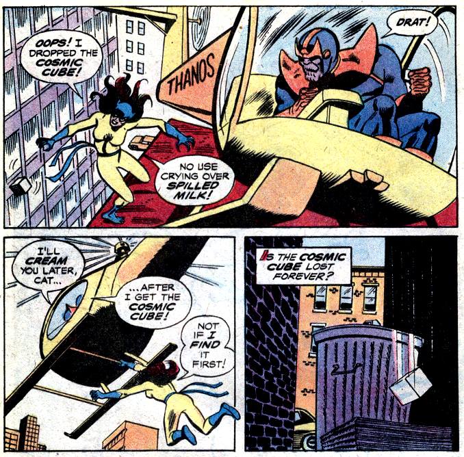 Squirrel Girl n’est pas la défaite la plus honteuse de Thanos. Dans une petite histoire humoristique de 1979, Thanos affronte Hellcat et Spider-Man. Ils lui font perdre le Cube Cosmique sans que les auteurs donnent une explication satisfaisante… mais Thanos obtient un Thanos-copter ! Un récit drôle, mais complètement décalé.