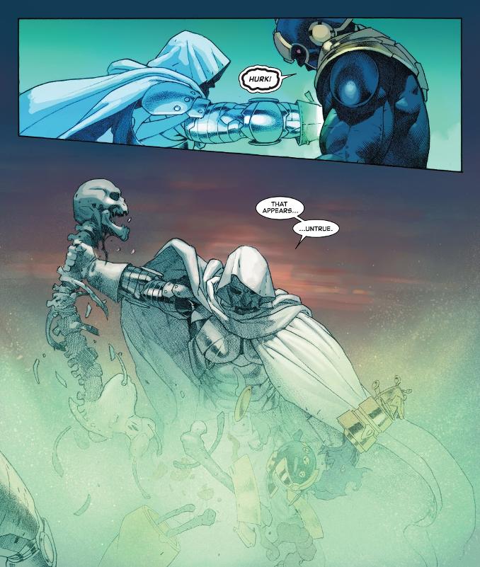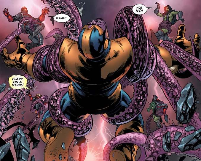 Dans Secret Wars, le Dr Fatalis a sauvé ce qu’il a pu du Multivers en créant Battleworld. Il en est le roi et a changé la mémoire de ceux qui y vivent. Thanos et quelques alliés se sont enfuis dans une navette avant ces évènements, et arrivent bien après sur Battleworld. Ils tentent de gêner le pouvoir en place, et Fatalis propose à Thanos de le servir ; le Titan refuse. Fatalis, alors tout puissant, s’emporte et arrache le squelette de Thanos. Pas propre, mais efficace.