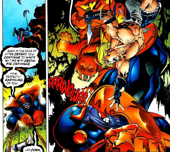 Ka-Zar est le Tarzan de Marvel, ami des X-Men vivant dans la Terre Sauvage, une zone tropicale protégée dans le Grand Nord par une mystérieuse technologie. Dans une des rares séries à son nom, Ka-Zar est confronté directement à Thanos, qu’on ignore alors n’être qu’un de ses clones. Ce faux Thanos manipule le frère supervilain de Ka-Zar pour obtenir la fameuse technologie. Thanos l’utilise pour s’enfuir de sa prison mystique, mais la Terre Sauvage gèle. Ka-Zar le provoque et est poursuivi par Thanos, tandis que sa femme Shanna fait exploser la machine. Thanos est renvoyé dans sa prison, défait par 2 aventuriers de la jungle.