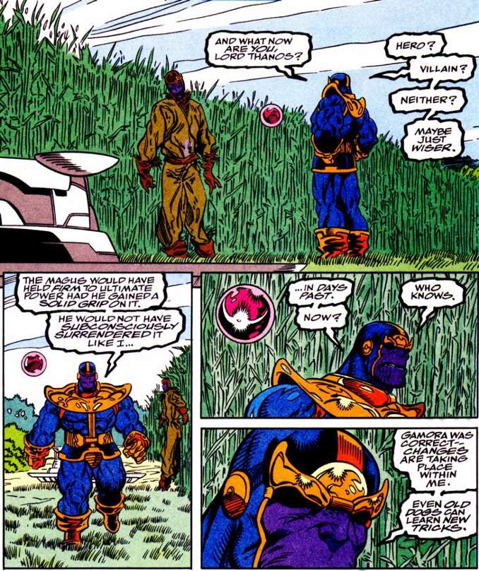 Jim Starlin est l’auteur qui a écrit la majorité des sagas de Thanos, dont Le Gant de l’Infini. Il en a fait un supervilain ambivalent, voir un antihéros. Plusieurs épisodes ont montré que s’il a toujours été défait… c’est parce qu’il le voulait, au fond. Se jugeant indigne par son histoire personnelle (paria parmi son peuple, amour unilatéral envers la Mort), il compense en cherchant un pouvoir absolu. Mais se refuse le droit de le garder, « permettant » ainsi aux héros de le stopper. Une théorie noble, même s’il faut surtout avouer que chaque défaite de Thanos vient de sacrés coups de chance. Thanos veut peut-être perdre au fond, mais il ne se laisse jamais faire ! ■