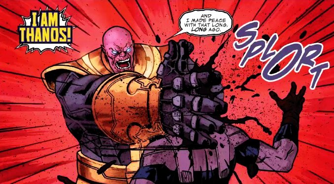 Voici probablement la scène la plus célèbre de toute la carrière de Thanos ! Quand la Mort ressuscite le Titan Fou, elle lui confie une mission : rétablir l’équilibre entre la vie et la mort dans l’univers. Selon elle, il y a beaucoup trop d’êtres vivants et il faut donc en supprimer la moitié. Thanos part alors en quête des Gemmes de l’Infini qui lui permettront d’avoir suffisamment de pouvoir pour accomplir sa quête. On connait la suite : il accomplit sa mission d’un simple claquement de doigts !