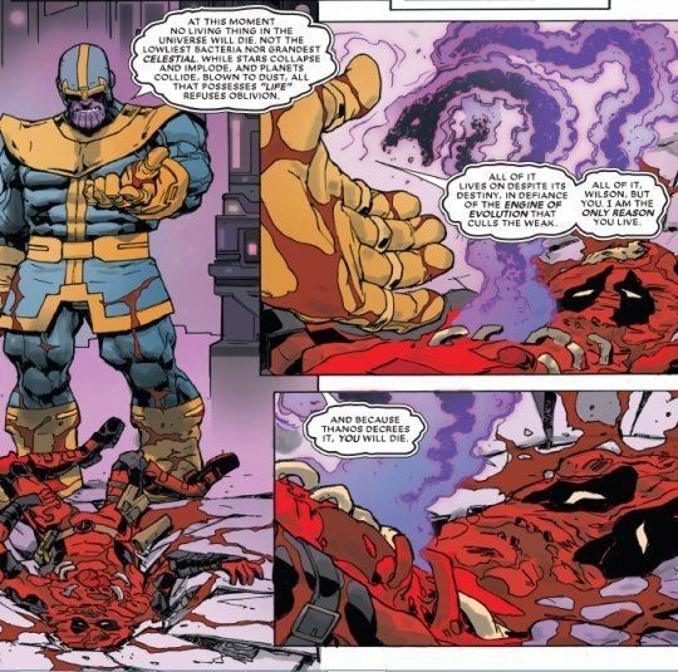 La Mort n’a pas qu’un seul prétendant. Thanos a de la concurrence en la personne de… Deadpool ! Autant dire que la situation ne plait guère au Titan Fou qui lance une malédiction sur son concurrent : la vie éternelle. Ce qui explique pourquoi Deadpool est à ce point résistant et que rien ne semble pouvoir le tuer. Deadpool a bien essayé de se débarrasser de Thanos. Malheureusement, tout ne s’est pas passé aussi bien qu’il l’espérait : Thanos l’a tout simplement réduit en bouillie !