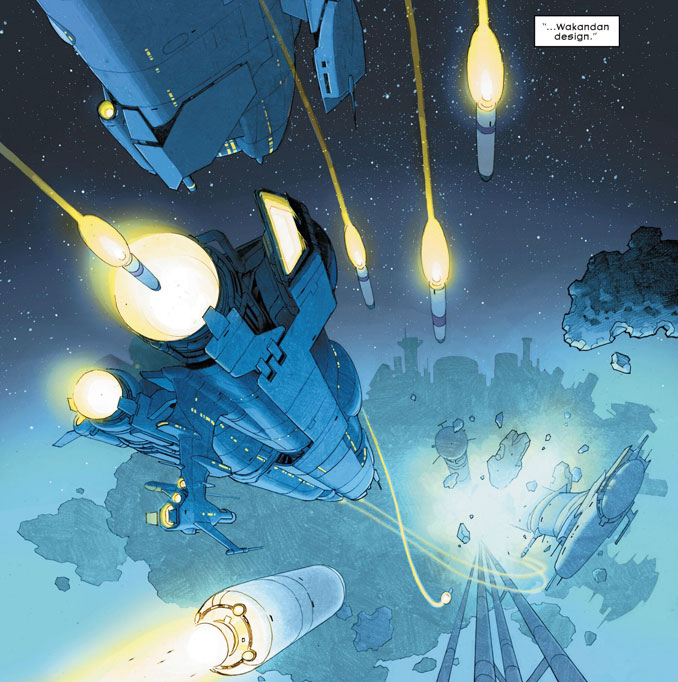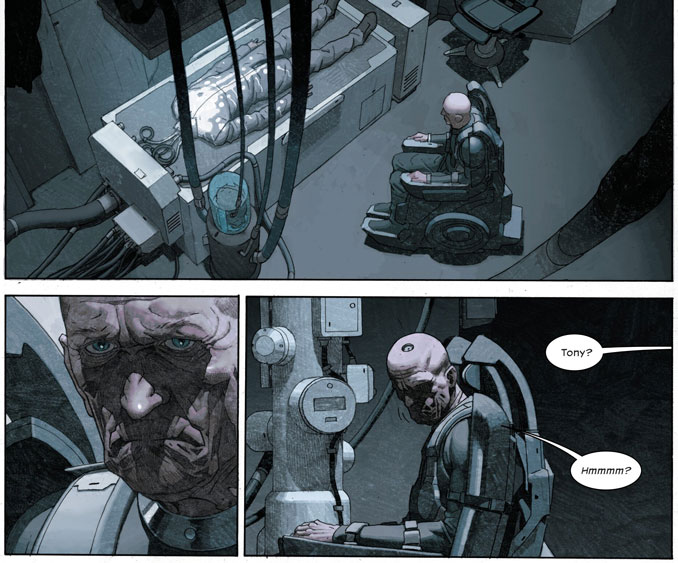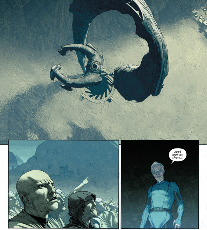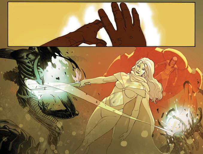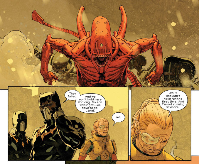 L’autre parti pris fort d’Aliens vs Avengers, c’est de nous montrer des Avengers très vieillissants, cabossés par toutes les crises possibles et imaginables, qui se retrouvent à gérer ce qui ressemble clairement à leur dernière mission, presque une retraite en enfer. Iron Man, Carol Danvers, un vieux Captain America, Miles Morales, et quelques mutants comme Armor et Manifold tiennent la baraque, mais Jonathan Hickman privilégie la grande fresque et les idées de scénario à la caractérisation fine, ce qui fait que les personnages se retrouve parfois à commenter l’action plus qu’à la faire vivre, Miles Morales notamment étant étonnamment sous-utilisé vu la place qu’on lui promettait au départ.