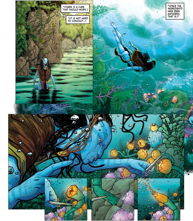 S’il y a une chose qu’on ne peut pas reprocher à Avatar – S’adapter ou mourir, c’est sa beauté visuelle. Agni R. Lobel et le coloriste Wes Dzioba livrent des planches lumineuses, pleines de détails végétaux, de textures vivantes et de couleurs presque phosphorescentes. On y retrouve la luxuriance du film de Cameron, cette sensation d’immersion totale dans une planète où tout semble respirer.