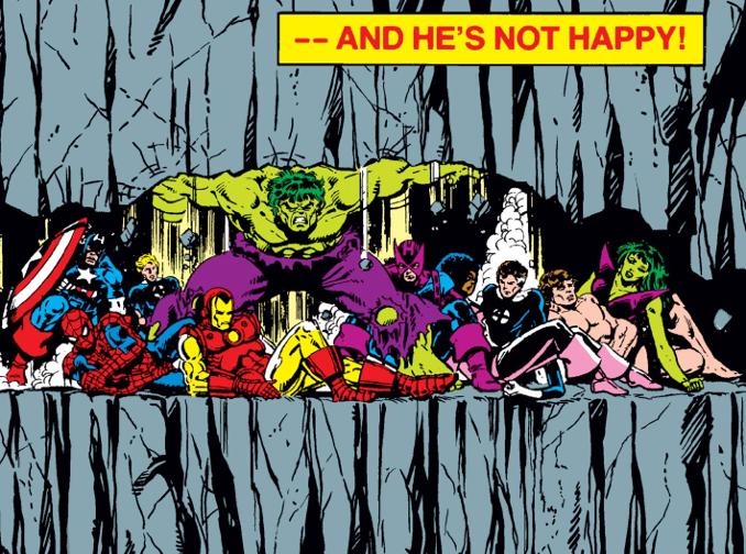 Dans Avengers : Endgame, Thanos détruit le QG des Avengers. Les superhéros doivent leur salut à Hulk, qui soutient les ruines du bâtiment sur ses seules épaules. Il s’agit clairement d’un clin d’œil à l’épisode 4 des Guerres Secrètes, où Hulk fait de même. Mais on peut aussi y voir un hommage à la couverture mythique de Hulk Annual 1 de Jim Steranko.