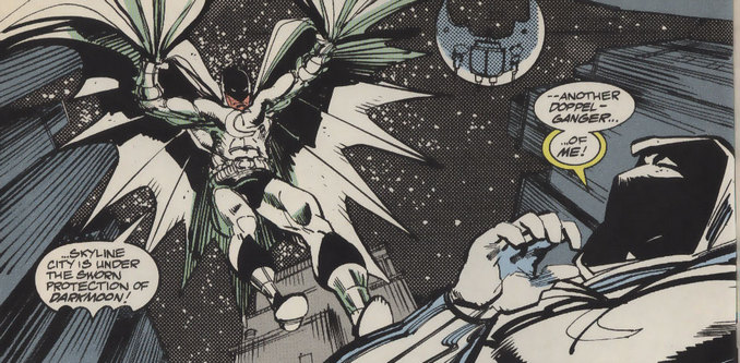 A ses débuts, Moon Knight a peu en commun avec Batman. Il se fait alors passer pour un homme de main d’organisations criminelles. Ses origines sont également très différentes. Marc Spector est un mercenaire laissé pour mort par ses employeurs lorsqu’il tente de sauver un archéologiste et sa fille Marlène. Il s’éveille persuadé d’avoir été sauvé par le dieu Khonshu et lui jure fidélité. Mais sa 1re série étoffe le personnage. Moon Knight utilise plusieurs identités : celle du riche Steven Grant ou du taxi Jake Lockley, à l’image de Batman et de ses avatars Bruce Wayne et Matches Malone. Comme d’autres pastiches de Batman, Moon Knight joue peu en équipe. Il rejoint les West Coast Avengers mais reste distant et finit par quitter l’équipe. La série Marc Spector : Moon Knight exploite les parallèles avec Batman en lui donnant un jeune partenaire, Jeff Wilde, alias Midnight. Mais Marvel aime torturer les acolytes. Midnight ne fait pas exception. L’empire secret le kidnappe et le convertit après l’avoir transformé en cyborg. Durant l’event Infinity War, la série Marc Spector : Moon Knight s’amuse de l’influence de Batman. En effet, le héros Marvel poursuit un double maléfique à travers les univers et croise des Moon Knight visiblement inspirés par les Batman de Dark Knight Returns, Batman : Holy Terror, de la série TV des années 60 ou encore du Batman vampire de Batman : Red Rain, illustré par le même Kelley Jones !