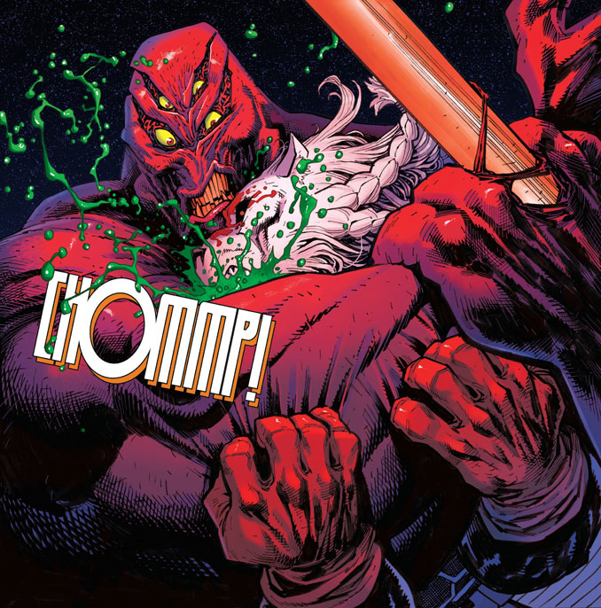 Bon, soyons honnêtes deux secondes : si vous ouvrez Battle Beast, c’est aussi pour voir Ryan Ottley se lâcher comme un damné. Et là-dessus, aucune arnaque ! Le dessinateur livre un festival de violence graphique qui ferait passer certains Mortal Kombat pour des spectacles pour enfants sages. Des têtes arrachées, des chairs déchirées, des entrailles répandues, des mâchoires qui servent d’armes blanches improvisées : tout y passe. Pourtant, le plus impressionnant n’est pas seulement la quantité de gore. C’est la lisibilité de l’action. Ryan Ottley découpe ses scènes de combat avec une efficacité redoutable. On comprend toujours où l’on est, qui frappe, qui tombe, qui se fait réduire en steak tartare. Et surtout, il peuple l’album d’une galerie de créatures vraiment réjouissante. Extra-terrestres massifs, monstres difformes, faune impossible, sorcellerie déviante : le bonhomme s’amuse, et ça se voit sur chaque page !