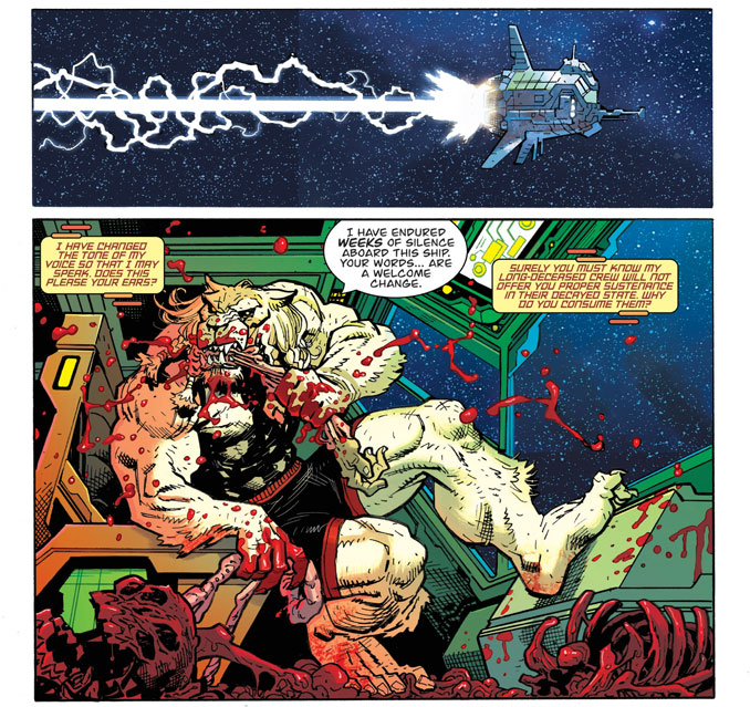 On pourrait presque passer à côté tant Ryan Ottley occupe la devanture, mais Annalisa Leoni fait un boulot essentiel sur Battle Beast. Sans elle, la série serait déjà spectaculaire. Avec elle, elle devient carrément habitée. Ses couleurs sculptent les atmosphères et permettent à l’album de passer sans heurt du space opera clinquant à la fantasy vénéneuse, puis du carnage rouge vif à des décors presque hypnotiques. Les planètes ont une vraie personnalité, les forêts alien paraissent à la fois superbes et malsaines, et le contraste entre la fourrure blanche de Battle Beast et les décors saturés fonctionne à merveille. D’ailleurs, Annalisa Leoni réussit quelque chose d’assez malin : elle rend le gore encore plus voyant sans jamais faire sombrer la page dans la bouillie illisible. Oui, il y a du sang partout. Mais il y a aussi une vraie science de la couleur derrière cette boucherie interstellaire.