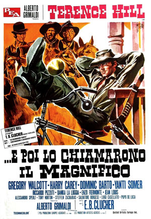 El Magnifico, c’est la rencontre improbable entre slapstick, western spaghetti et une atmosphère bucolique et contemplative. Les paysages verdoyants de Yougoslavie remplacent les décors poussiéreux habituels, la bande-son signée De Angelis glisse vers la mélancolie et le film semble vouloir dire quelque chose : l’Ouest s’éteint peu à peu, la modernité arrive (le train n’est jamais loin), les cow-boys s’effacent pour devenir des souvenirs. Le film amuse, mais il regarde l’horizon avec une certaine émotion nostalgique. Pas un simple divertissement donc, mais un adieu tendre à un genre entier.