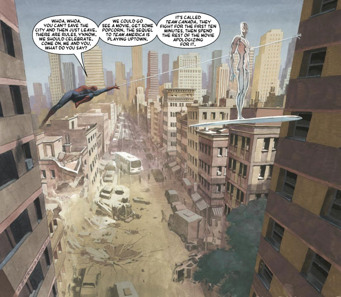 Le Silver Surfer a toujours eu un petit côté philosophe en slip métallique. Depuis Stan Lee et John Buscema, le personnage adore contempler l’humanité depuis les hauteurs, en se demandant pourquoi cette fichue espèce passe autant de temps à s’autodétruire. Ici, J. Michael Straczynski reprend cette veine, mais il évite de transformer Norrin Radd en distributeur automatique de grandes phrases. Le Surfer observe, bien sûr. Cependant, il agit aussi. Il offre à l’humanité un bref moment d’espoir, presque une respiration collective. On pourrait trouver ça naïf. D’ailleurs, on aurait presque envie de ricaner deux secondes. Puis l’émotion fonctionne. Parce que le récit assume sa sincérité. Dans un univers Marvel souvent occupé à relancer des events tous les quinze jours, voir un héros prendre le temps de dire adieu, ça fait un drôle d’effet.