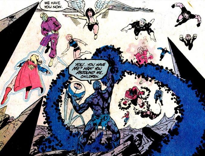 Jusqu’où iriez-vous pour détruire le Mal incarné ? Une assassin amazone, Myrina, est allée jusqu’à concevoir un enfant avec Darkseid pour détruire ce dernier. Elle utilise son enfant, Grail, pour attirer sur Terre une entité capable de tuer Darkseid : L’Anti-Monitor ! Peu importe alors que les dommages collatéraux se comptent par milliards. Exilé sur Apokolips avec Luthor, Superman trouve une nouvelle puissance dans les puits de la planète maudite. Batman gagne également le pouvoir d’un Néo-Dieu lorsqu’il s’empare de la Chaise de Métron. Mais c’est un autre membre de la Ligue qui cause la perte de Darkseid. Alors que Darkseid et l’Anti-Monitor s’affrontent, le dieu d’Apokolips semble prendre le dessus. En réalité, il est tombé dans le piège de l’Anti-Monitor. Celui fait de Flash le nouvel avatar du Black Racer, l’incarnation de la Mort pour les Néo-Dieux. En un instant, Flash fauche Darkseid qui meurt sur le coup. Ce n’est cependant pas la fin pour lui. Alors que Lex Luthor revendique son trône, Darkseid se réincarne dans l’enfant de Superwoman.