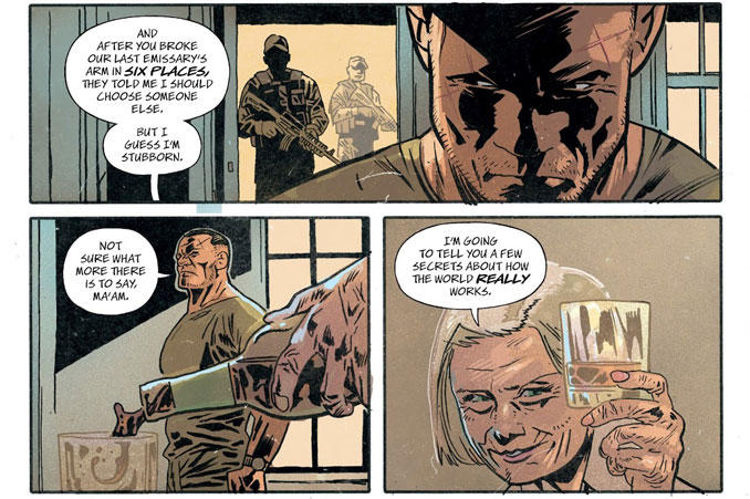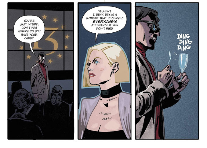 Michael Walsh (Frankenstein, Justice League/Black Hammer) met en scène les assassins comme des figures presque mythologiques. Leurs entrées sont spectaculaires, parfois glaçantes, parfois presque ironiques. Chaque tueur possède une identité visuelle forte, immédiatement lisible. Les révélations fonctionnent comme des coups de théâtre graphiques, accentués par les couleurs de Jordie Bellaire, volontairement sourdes. Ce contraste rend la violence plus sèche, plus brutale. Le sang ressort davantage, sans jamais sombrer dans l’illisible ou la surenchère gratuite.