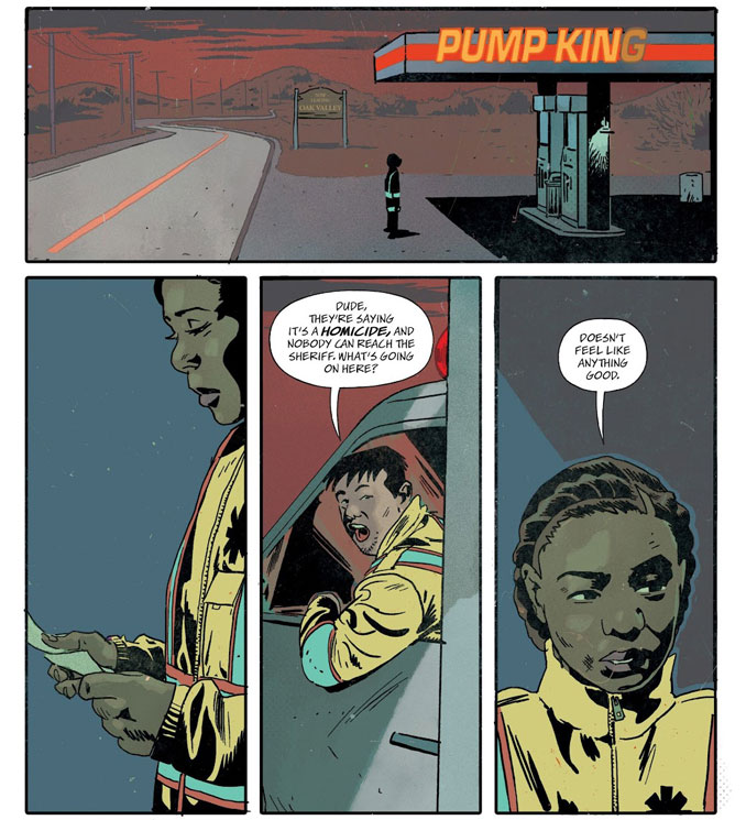 La série ne se contente pas d’aligner des psychopathes. Exquisite Corpses prend le temps d’installer quelques habitants d’Oak Valley. Des figures ordinaires, reconnaissables, parfois attachantes. Cette attention portée aux victimes potentielles renforce l’impact émotionnel du récit. On sait très vite que tout le monde ne s’en sortira pas. James Tynion IV installe une empathie simple mais efficace, qui donne un poids réel aux scènes de violence, sans tomber dans le pathos.