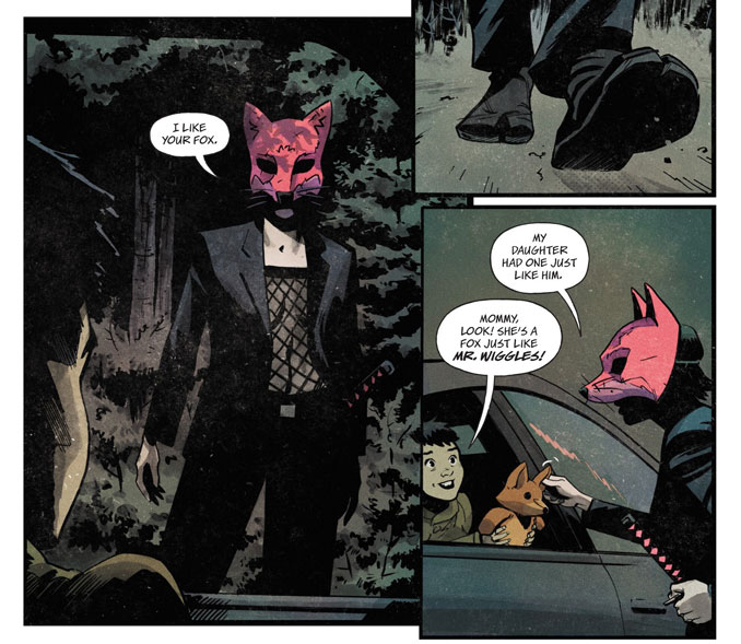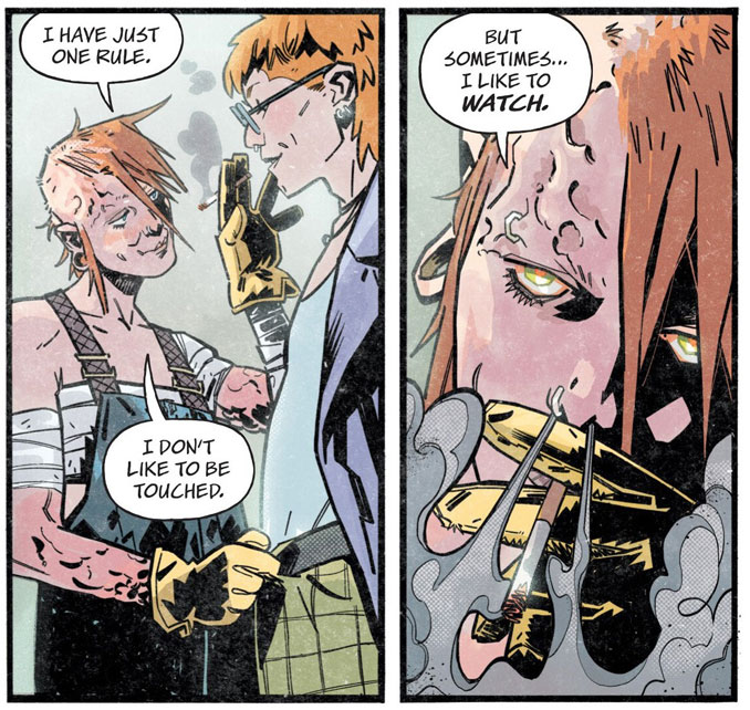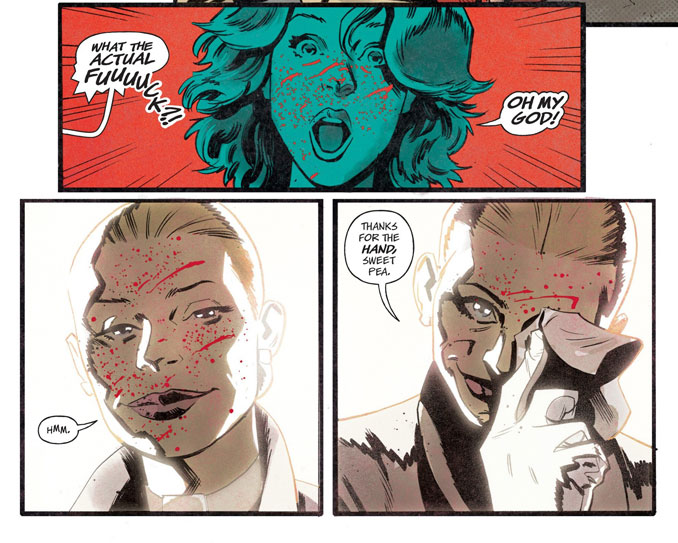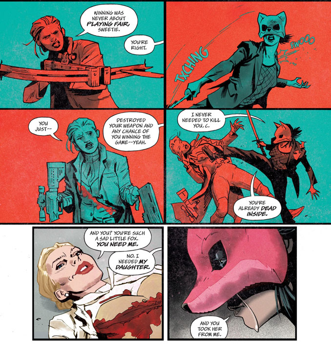 L’autre belle surprise de ce tome, c’est la manière dont certains tueurs gagnent en relief. L’épisode 4 repose sur un duel très tendu, tandis que le 5 préfère une dynamique plus tordue encore avec Layla Blaze et Slater. Jordie Bellaire s’amuse à écrire une forme de flirt morbide entre deux machines à tuer qui se tournent autour comme dans une romance malade. Sur le papier, cela pouvait vite devenir gênant. Pourtant, le résultat a quelque chose de franchement réjouissant dans sa folie.