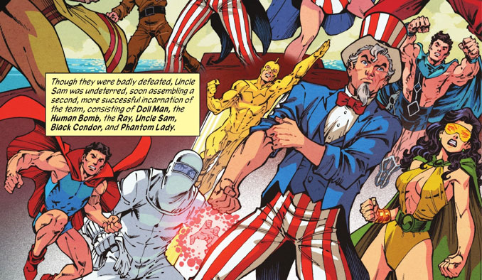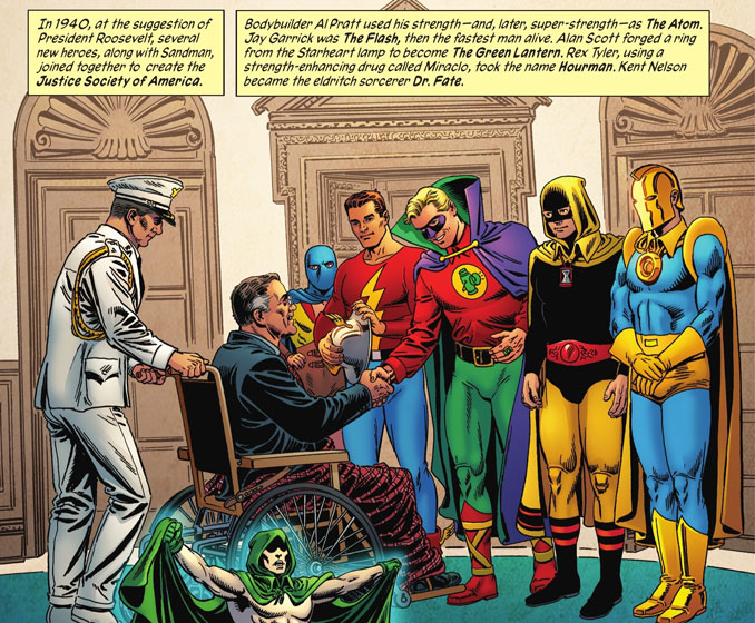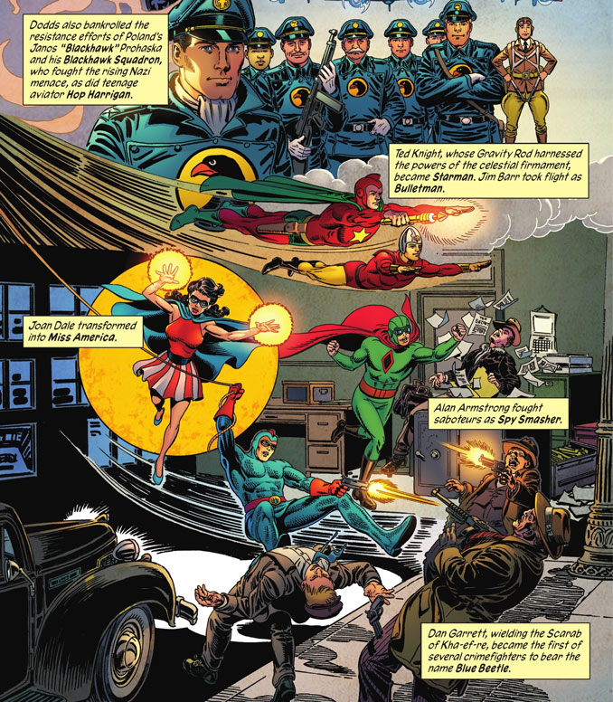 Plus loin, Marl Waid nous amène à l’Âge d’or. JSA, Seven Soldiers of Victory, Jonah Hex, Sgt Rock… pas seulement les têtes d’affiches, mais ceux qui ont construit le mythe. Il ne s’agit pas de nostalgie : le récit replace chacun à sa juste place dans la ligne temporelle. On retrouve le plaisir de consulter une archive chronologique. Pour les lecteurs de 30-50 ans, ça fait parfois l’effet d’ouvrir un vieil album. Pour les nouveaux, c’est un plan du musée DC avec des petits panneaux explicatifs partout. Bref, c’est nickel.