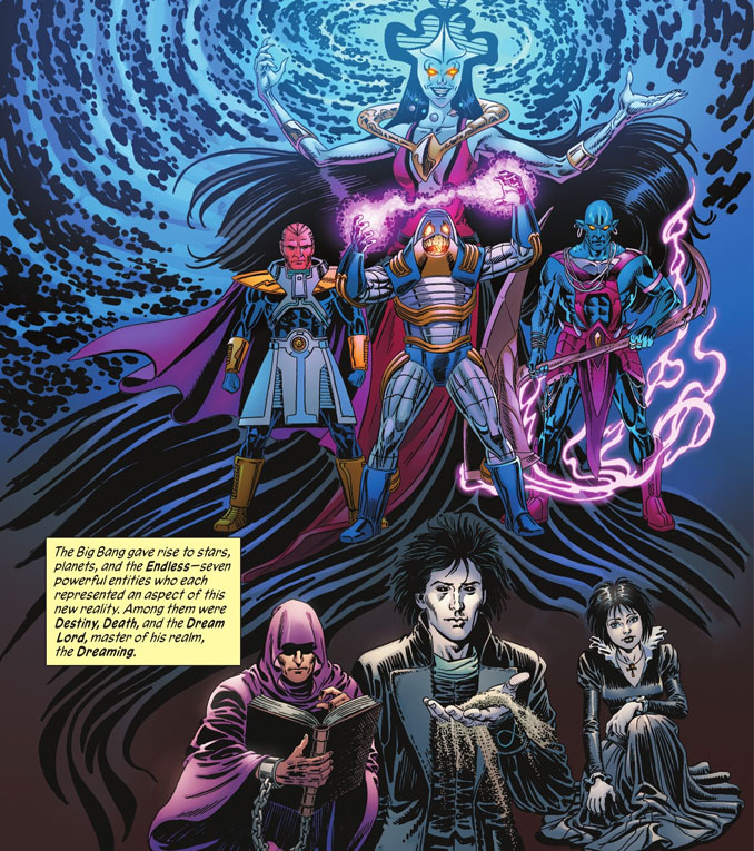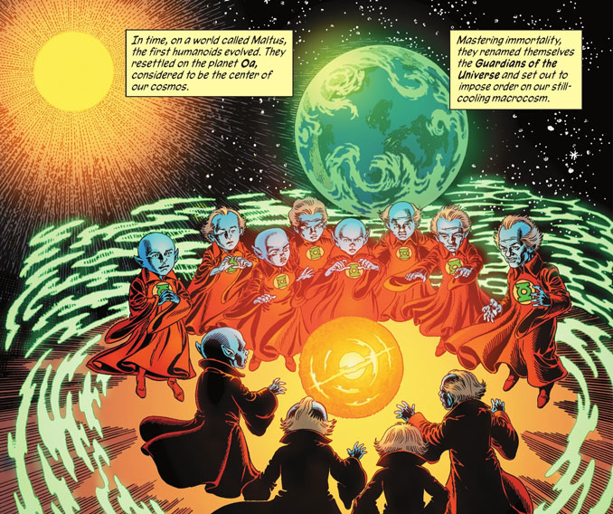 L’album prend son temps pour poser la cosmogonie DC. Après la naissance du Multivers, Destiné, Rêve et Mort (provenant de l’univers de Sandman) apparaissent pour incarner les forces métaphysiques. Une manière de dire : tout ça compte, tout ça coexiste chez DC. Ce n’est pas juste un résumé, c’est une hiérarchie du cosmique. Mark Waid enchaîne ensuite avec la création des Cieux, de l’Enfer, puis l’arrivée des premiers êtres cosmiques liés aux Green Lanterns. Certaines idées sont brillantes, réconciliant des histoire parfois contradictoires. On se surprend même à penser : mais pourquoi DC n’a pas fait ça avant ?