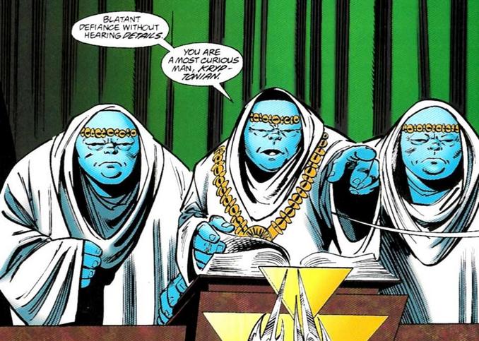 Encore des hommes bleus qui pensent être l’autorité suprême de l’univers ! Le Tribunal est un trio d’extraterrestres massifs, assez puissants pour tenir tête à Superman et disposant de 4 bras. Mais leur trait le plus marquant est leur dévotion fanatique à une notion toute particulière de la justice. En effet, pour le Tribunal, tout crime appelle une condamnation. Qu’il s’agisse du véritable coupable ou d’un lointain ancêtre importe peu. Le Tribunal découvre ainsi qu’un aïeul de Superman, Kem-L, est le créateur de l’Eradicator, une arme qui lie chaque habitant de Krypton au sol de la planète. Tout kryptonien s’envolant dans l’espace meurt peu après. Pour le Tribunal, cette action a condamné la race de Superman, et Kal-El doit payer pour le crime de son ancêtre ! Lorsque Superman s’évade des geôles du Tribunal, leur dirigeant, Tribunal-Prime, devient obsédé à l’idée de le capturer et de l’exécuter. Il n’hésite pas à engager le Cyborg Superman pour le neutraliser. Et quand le Cyborg parvient à capturer Superman, Tribunal-Prime se retourne contre lui et le torture pour lui faire avouer sa culpabilité dans la destruction de Coast City. Lorsqu’un autre membre du Tribunal ose le défier, il menace ou frappe celui-ci. C’est la transgression de trop et le reste du Tribunal se retourne contre lui. Mais leur attachement religieux à une justice aveugle empêche ce qui reste du Tribunal à exonérer Superman. Il se contente de condamner Kal-El à défendre la justice sur Terre pour le restant de ces jours…