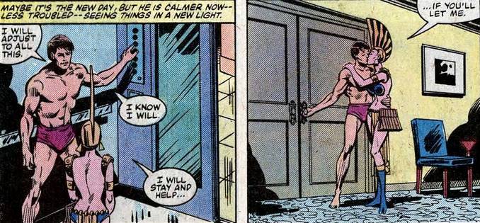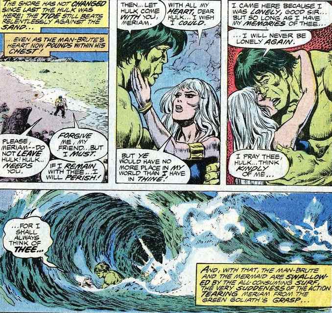 Dans les 1res pages d’Incredible Hulk n°217, notre héros vert tombe sur un étrange campement. Des phénomènes de foire l’accueillent en leur sein après un 1er contact quelque peu rugueux. En effet, ils ont fui le Cirque du Crime et leur chef, le Maître de Manège. Surpris de leur absence de peur ou de méfiance à son égard, Hulk accepte de les accompagner. Plus spécifiquement, il tombe sous le charme d’une des leurs, Meriam, une femme à l’apparence diaphane. Si peu de temps après le décès de Jarella, Hulk consent à rester pour Meriam Il aide la troupe dans son périple, abattant notamment un arbre gigantesque pour s’en servir comme pont. Mais le Cirque du Crime les rattrape et parvient à les capturer. Le Maître de Manège neutralise Hulk en l’hypnotisant. Cependant, en entendant que Meriam est menacée, Hulk sort de sa transe et libère tout le monde. Meriam doit alors lui expliquer qu’elle doit le quitter : elle est une naïade venue sur terre pour découvrir l’humanité, mais elle ne peut rester plus longtemps sous peine de mourir. Hulk doit la ramener à la mer, où Meriam lui fait ses adieux.