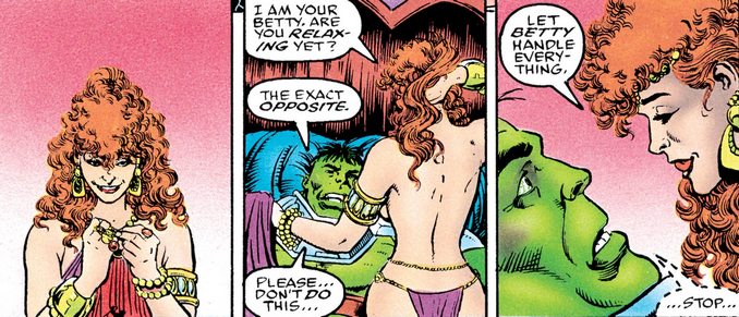 Peu avant le mariage entre Rick Jones et Marlo Chandler, Rick reçoit une visite étonnante : celle de Janis Jones, sa propre arrière-petite-fille ! Celle-ci vient d’un futur apocalyptique afin de demander l’aide de Hulk. Celui-ci est le seul à pouvoir faire face au tyran qui tient l’humanité sous son joug, le Maestro. En réalité, le Maestro n’est autre qu’un Hulk qui a survécu à la destruction. L’affrontement entre le Maestro et Hulk ne pouvait avoir qu’une issue. Plus puissant et expérimenté, le Maestro brise la nuque de Hulk. Hulk survit mais reste paralysé un temps. Le Maestro en profite pour le briser psychologiquement. Il lui envoie en effet l’une des esclaves de son harem, qui couche avec Hulk malgré les protestations de ce dernier. Pour mieux le détruire, le Maestro envoie le reste de ses favorites s’occuper de Hulk lorsqu’il l’entend hurler. Si Hulk réussit finalement à vaincre le Maestro, il garde des séquelles psychologiques de ce viol. Pour sa part, l’esclave, Betty-6, réapparaît dans la série Abominations. Elle retourne dans son passé, le présent de l’univers Marvel, afin de protéger son enfant nouveau-né. Même elle ignore si le père est le Maestro ou Hulk…