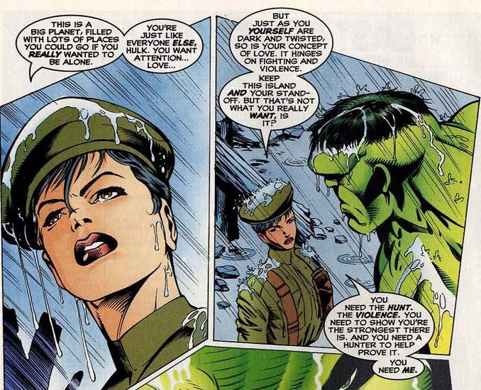 Je vous l’accorde, cette entrée est tirée par les cheveux. La Colonel Carolyne St. Lawrence prend en charge les unités militaires anti-Hulk immédiatement après la disparition des héros face à Onslaught. Un travail difficile, surtout lorsqu’elle voit Hulk affronter successivement le Panthéon et les Thunderbolts. Séparé de Bruce Banner, Hulk devient plus machiavélique. Bien décidé à ce que les militaires le laissent en paix, Hulk prend en otage l’archipel des Keys en Floride. Mais c’est un autre Hulk qui vient changer la situation. Cette version de Hulk a tué le Maestro et pris sa place avant de réaliser que la situation l’avait corrompue. Il vient donc donner une leçon à Hulk, de gré ou de force. Mais lorsqu’il croise Cary St Lawrence, tout le monde est abasourdi de le voir embrasser la militaire ! Mais cette dernière n’est peut-être pas si étonnée. En effet, le Hulk alternatif finit par disparaître. Elle s’adresse alors au véritable Hulk en lui disant qu’il ne veut pas réellement qu’on le laisse seul. Selon Cary St Lawrence, Hulk recherche de l’attention, et sa version distordue de l’amour implique qu’on le traque. Qu’elle le traque ! La narration semble lui donner raison. Pourchassé par les troupes de St. Lawrence, Hulk se sent aimé… Lorsque, quelques numéros plus tard, le Général Ross lui parle d’une grâce de Hulk, Cary repense au baiser de l’autre version du monstre, et ne semble pas hostile à l’idée que cette romance devienne réalité. La conclusion du run de Peter David semble confirmer que le couple se serait formé s’il avait continué à écrire la série.