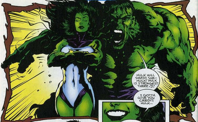 Si je parle de relations sexuelles entre Jennifer Walters et son cousin Bruce Banner, vous pensez peut-être à Mark Millar ? En effet, dans Old Man Logan, l’auteur iconoclaste décrit un futur dans lequel Hulk a fondé un clan en ayant des enfants avec sa cousine. Le résultat de cet inceste ? Des Hulks dégénérés. Mais pour une fois, cette idée scabreuse de Millar ne sort pas de nulle part. En effet, l’Annual Incredible Hulk Annual de 2000 s’ouvre avec un Hulk qui se remémore le décès de Betty Banner et de Jarella. Ces souvenirs le lancent dans une rage folle. Les Avengers surveillent sa trajectoire et se rendent sur place avec Jennifer Walters, Miss Hulk. Lorsqu’ils arrivent sur les lieux, Hulk fonce sur Miss Hulk et la renverse, lui fracturant une côte. Les Avengers attaquent le temps qu’elle se remette. Une fois debout, elle tente de calmer Hulk qui redevient Banner. Cependant, Bruce hurle de panique en voyant Jennifer Walters et se retransforme en criant le nom de Betty, frappant Miss Hulk au visage. Vision réalise ce qui arrive. Le deuil de Banner pousse Hulk à trouver une compagne. Cependant, l’instinct primal de Hulk le pousse à rechercher une partenaire de son espèce, et la seule candidate est Miss Hulk. Son attaque sur elle est l’équivalent d’une parade amoureuse. Jennifer Walters fait son possible pour expliquer la situation à son cousin. Se voyant rejeté, Hulk s’enfuit en larmes.