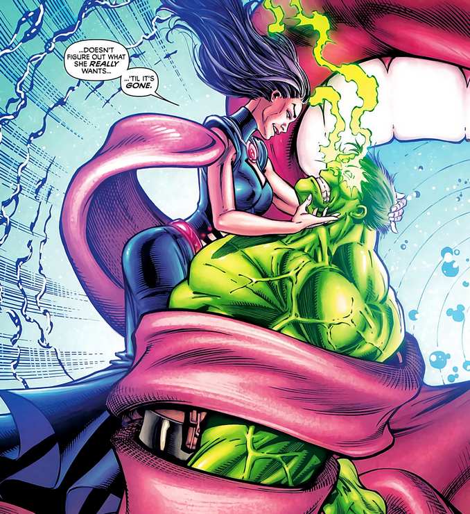 Dans la série Defenders de 2005, Cauchemar avertit le Dr Strange d’une invasion imminente de Dormammu. Stephen Strange recrute Hulk et Namor pour lui prêter main forte, mais la mission tourne mal dès le 1er instant et les Défenseurs sont capturés. Hulk attire l’attention d’Umar. Celle-ci, la sœur de Dormammu, fait de Hulk son esclave sexuel. Si elle admire sa… constitution, Hulk déçoit Umar car il s’épuise après quelques minutes d’ébats. Pire encore, il redevient Bruce Banner, qui ne parvient pas à se retransformer en Hulk. Umar promène Banner en laisse et le rend aux Défenseurs qu’elle aide à vaincre Dormammu. Ce n’est cependant pas la fin de leur histoire. Dans Incredible Hulks n°630 à 635, Hulk et ses proches sont confrontés à Tyrannus. Celui-ci prend le contrôle d’une source exauçant les souhaits, qu’à créé Monica Rappaccini. La multiplication des vœux fait apparaître les vieux ennemis du géant vert, dont Umar. Dans Incredible Hulks n°633, Umar décide de ramener Hulk dans sa dimension, en tant qu’égal cette fois. Hulk est plus performant que durant sa précédente visite. Leur rapport sexuel dépasse les 3 heures continues lorsqu’une attaque troll y met fin !