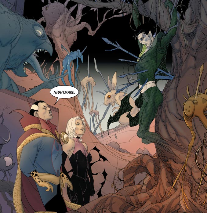 L’enquête sur les assassinats ouvre la porte du versant « procédural ». Andy MacDonald (dessins) et Kike J. Díaz/K.J. Díaz (couleurs) signent des chapitres nerveux où Wong prend la lumière, épaulé par Pandora Peters et la cellule du BAGET. On visite coulisses, archives, arrière-boutiques des dimensions parallèles : la série respire plus large. Ce détour n’est pas un hors-sujet : il clarifie l’écosystème mystique et prépare le feu d’artifice à venir.