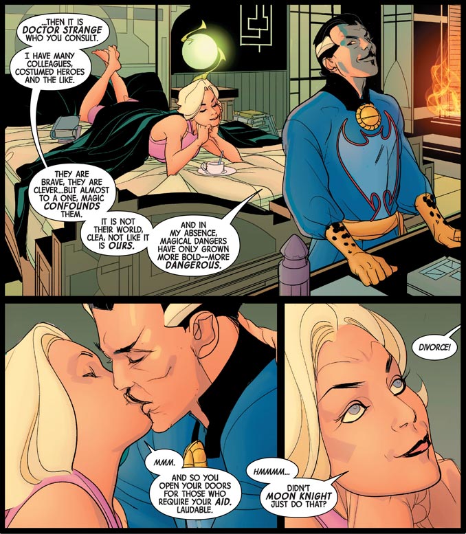 La meilleure idée de Jed MacKay tient en deux prénoms : Stephen et Clea. Leur duo n’est pas un gadget romantique, c’est le cœur organique du titre. Ils soignent par la parole, tranchent par la magie, et se tirent mutuellement vers le haut. L’album en fait un vrai feuilleton conjugal (avec piques, regards, et silences), où la tendresse ne tue jamais la dramaturgie. Quand Clea s’emporte, Stephen temporise. Quand Stephen doute, Clea charge. Les scènes du « mariage infernal » d’Umar condense à elles seules ce ballet… pour le moins explosif.