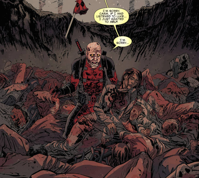 L’histoire se termine sur une note particulièrement amère : Deadpool découvre qu’il avait une compagne et un enfant, mais perd tragiquement les deux. Pire encore, il porte une part de responsabilité directe dans leur sort. Chargé de culpabilité et de douleur, ce récit explore des thèmes de souffrance et d’immoralité, offrant une facette inattendue, poignante et sombre de l’univers de Deadpool.