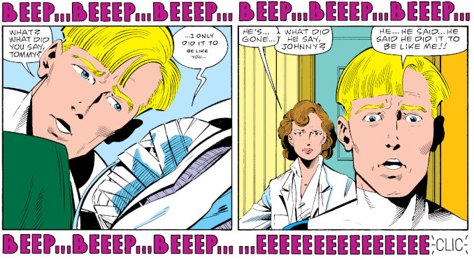 La Torche Humaine rencontre Tommy sur son lit de mort, où l’enfant prononce ces mots déchirants : « Je voulais juste être comme toi. » Ces paroles plongent Johnny Storm dans une profonde remise en question, au point de le pousser à envisager d’abandonner son identité héroïque. L’intervention du Beyonder, qui lui fait revivre certains événements du passé, apporte une forme de perspective, mais une mélancolie palpable imprègne toute l’histoire.