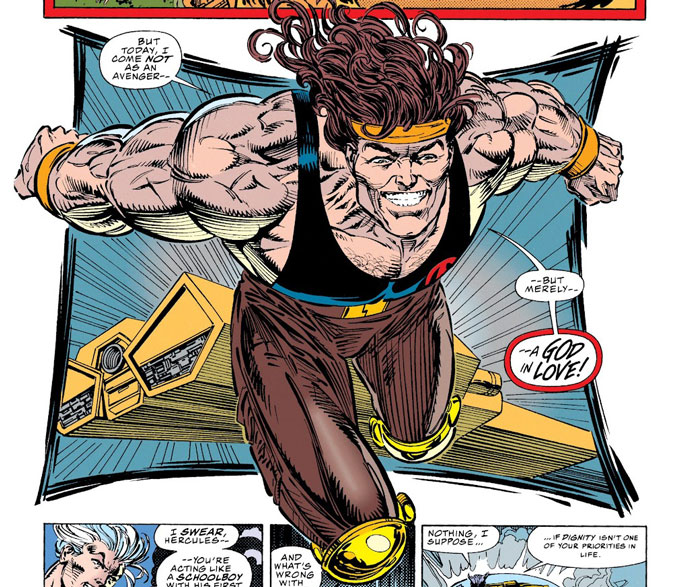 Mais au début des années 1990, lors de son retour chez les Avengers, les choses se compliquent. Thor porte lui aussi une barbe à cette période, et l’idée surgit qu’avoir deux barbus dans l’équipe ferait bizarre. Mauvais calcul. Hercule rase donc sa barbe, perdant au passage une bonne partie de sa prestance, puis hérite d’un costume dépourvu de toute référence classique. Progressivement, même cette tenue disparaît, remplacée par un simple débardeur et un pantalon. Un choix étonnamment terre-à-terre pour un demi-dieu, qui finit par vider le personnage de toute sa majesté et lui fait perdre ce qui le rendait si mythique.