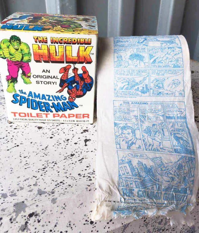 Un comics tellement mauvais que vous auriez envie de vous essuyer avec, ça vous dit ? Marvel l’a fait ! Au début des années 1970, Marvel propose ce rouleau de papier toilette original puisqu’on peut y suivre (si on veut) une histoire de Spider-Man et Hulk. Une aventure forcément éphémère puisqu’elle finira au fond des WC !