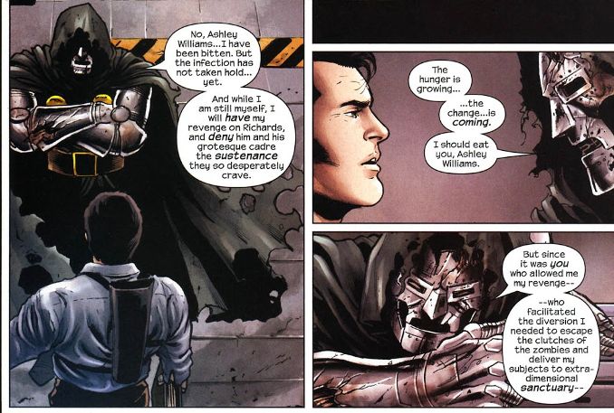 L’univers Marvel Zombies est condamné. Lorsqu’on le découvre dans Ultimate Fantastic Four, les zombis ont déjà dévoré l’humanité de leur terre. À l’issue de leur 1re minisérie, les Marvel Zombies dévorent Galactus et partent parcourir l’univers à la recherche de mondes à boulotter. Certaines séries reviennent aux origines. Le one-shot Dead Days montre que certaines régions résistent à la contamination, comme la Latvérie. Le crossover Army of Darkness/Marvel Zombies suit l’arrivée de Ash Williams dans ce monde. Il pense que, comme dans Evil Dead, c’est le Necronomicon qui est à l’origine de la contamination. Avec l’aide de Dazzler et de la Sorcière Rouge, il se rend en Latvérie : c’est en effet Fatalis qui détient l’ouvrage maudit. Au même moment, les zombis menacent la Latvérie. Fatalis est mordu par un Reed Richards zombifié mais, par pure détermination, résiste le temps d’évacuer des survivants vers d’autres dimension. Lui-même reste en arrière pour ralentir les zombis et détruire la machine qui a permis la fuite des humains.