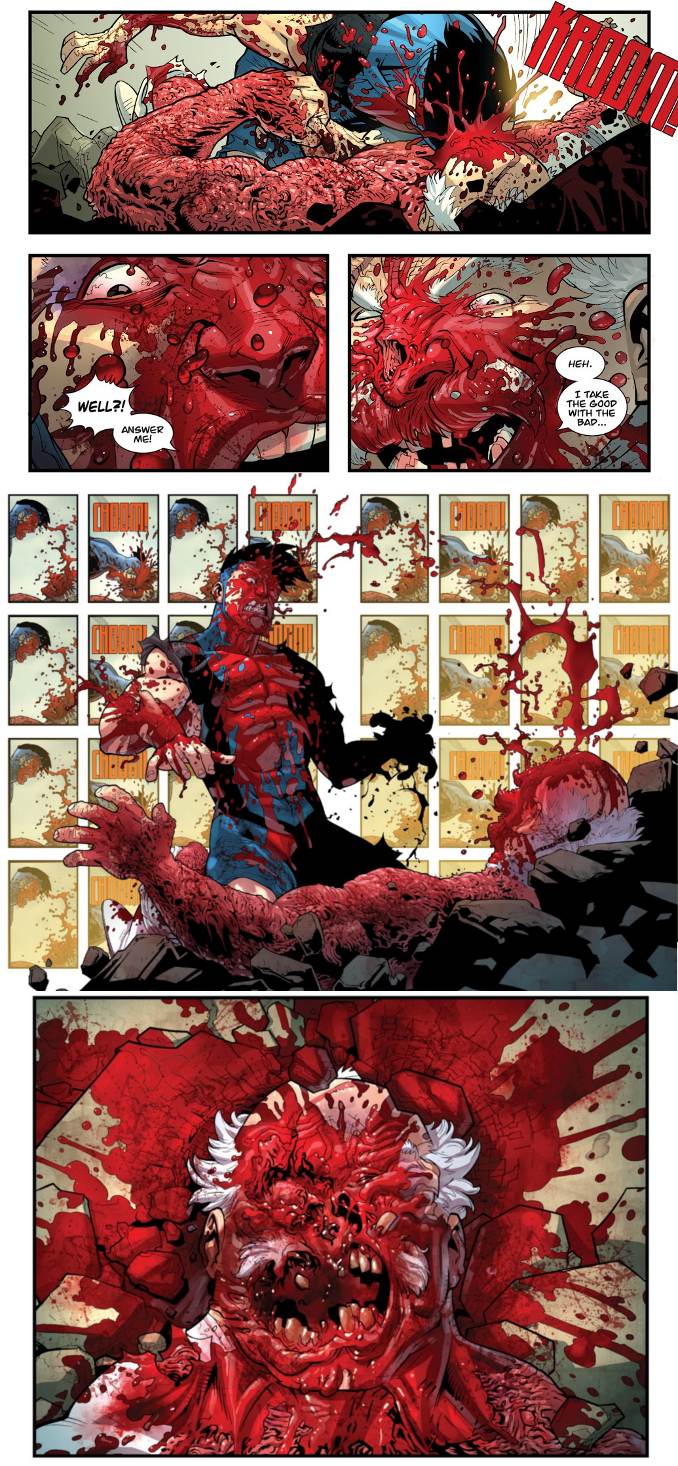 Invincible, c’est la relecture de Superman et du genre super-héroïque par Robert Kirkman. Sauf que le créateur de Walking Dead ne peut pas s’en empêcher : à un moment, il faut bien que ça dérape. Dans Invincible 64, Robert Kirkman et Ryan Ottley ne font vraiment pas les choses à moitié ! Invincible, le jeune héros, a vu sa copine Eve se faire massacrer par le super-vilain Conquest. Ivre de rage, Invincible se lance alors dans un combat furieux. Les 2 adversaires ne retiennent plus leurs coups. Conquest et Invincible se mordent violemment jusqu’à s’arracher des lambeaux de peau. Conquest réplique en brisant la main d’Invincible. Le super-héros finit par rouer le visage de son ennemi de violents coups de poing et lui défonce littéralement le crâne.