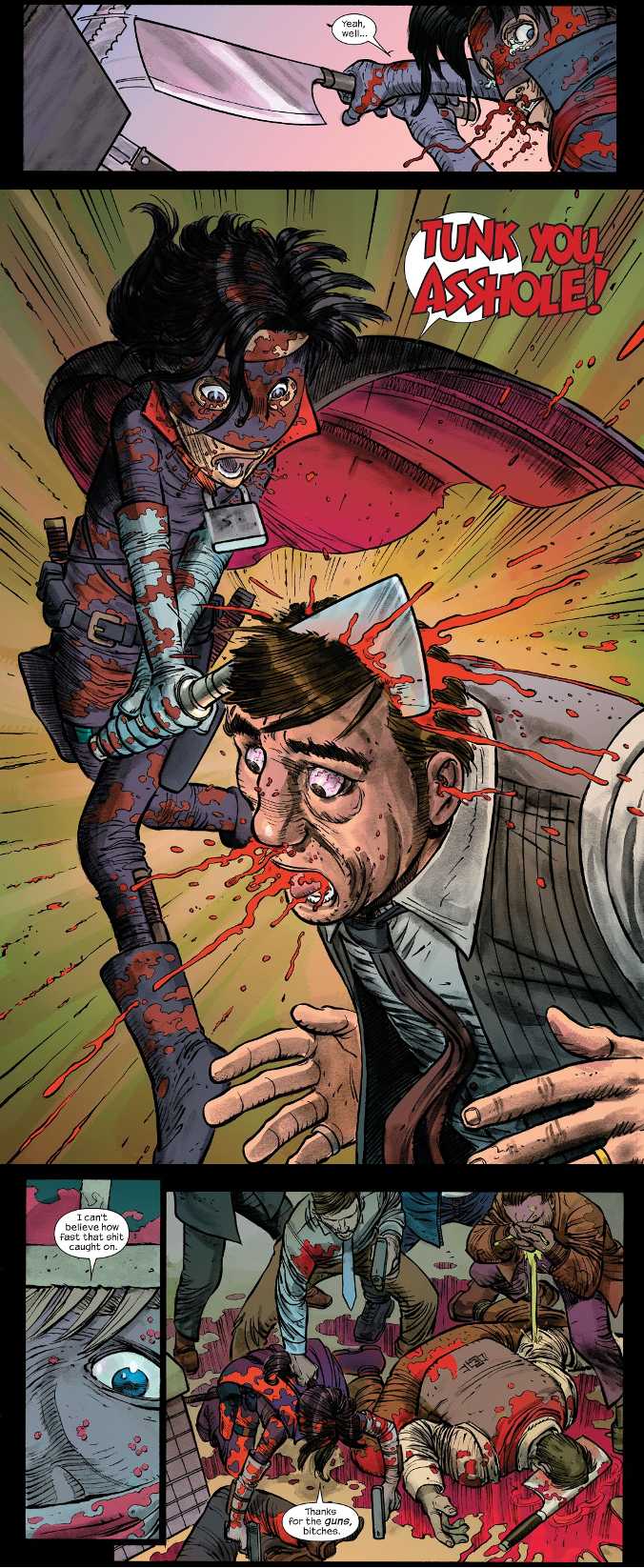 Kick-Ass, évidemment. Le comics gore de Mark Millar et John Romita Jr se devait de figurer dans ce top. Comme pour Walking Dead, il y aurait moyen de faire une liste des plus grandes scènes gores dans les séries Kick-Ass. Aujourd’hui, on va se contenter de ce magnifique coup de hachoir en plein sur un crâne, une scène se déroulant à la fin de la 1re série Kick-Ass. Mal de crâne assuré.