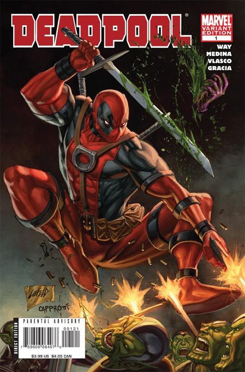 Rob Liefeld a imaginé le personnage de Deadpool. Il est donc logique qu’on le retrouve invité sur de nombreuses couverture des séries dédiées au Mercenaire disert ! Et donc sur cette couverture alternative de l’épisode 1 du run de Daniel Way et Paco Medina. Nous sommes alors en 2008, en plein crossover Secret Invasion. Et avouez que ce dessin a de la gueule ! Deadpool bondissant épée à la main parmi une horde de Skrulls, taillant dans le vif (et hop, une main qui vole !). À noter la colorisation de Mike Capprotti qui donne un côté « peint » et qui donne un certain cachet au dessin.