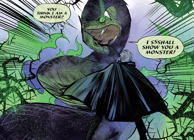On ne va pas se mentir. Si vous ouvrez un comics Maléfique, vous attendez du spectaculaire. Serpent géant ? Oui. Des félins ? Évidemment. Ronces assassines ? Bien sûr. Soo Lee s’amuse avec la mythologie. Mais elle ne copie pas le film. Les métamorphoses sont plus sauvages, plus organiques. Parfois presque brutales.