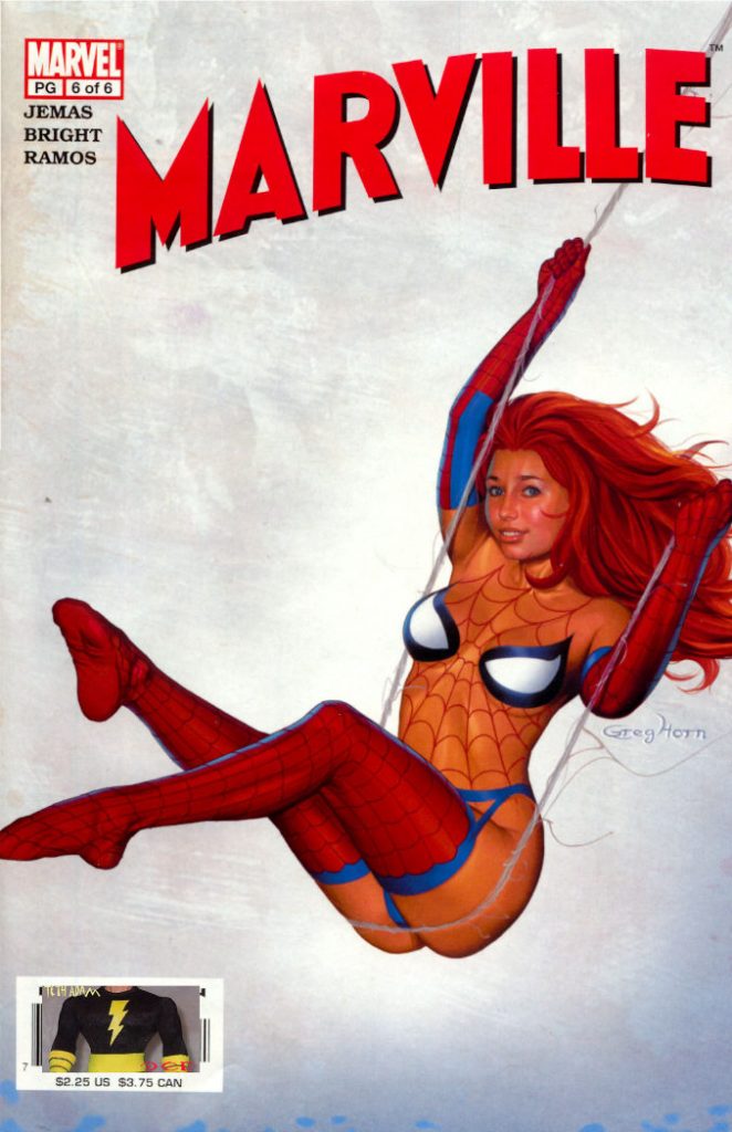 Marville a tenu sept numéros. Sept. Et chaque couverture signée Greg Horn était un chef-d’œuvre de mauvais goût, un festival de ce qu’il ne faut jamais faire quand on dessine une femme (ou un être humain, en fait). Je vous mets la couv’ du numéro 6, mais le reste est du même tonneau. Tentative pathétique de satire pop, le comics a surtout déchaîné les critiques pour son côté racoleur et son humour de CM2 en pleine crise existentielle. Les persos féminins ? Des créatures sorties d’un rêve érotique sous Photoshop 4.0 : visages figés, poses absurdes, regard vide façon poupée possédée. C’était censé être sexy, c’était juste flippant. On ne sait pas si c’est une parodie ratée ou un accident industriel… mais dans tous les cas, Marville reste une légende. Une légende noire, certes, mais une légende quand même.