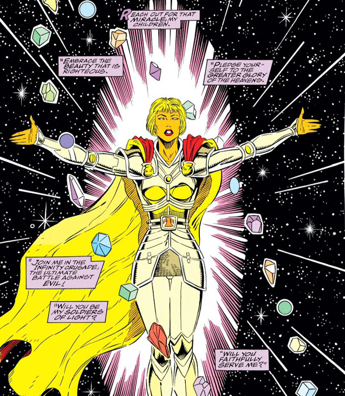 Lorsque Adam Warlock entre en possession du Gant de l’Infini, les conséquences dépassent largement ce qu’il imagine. Sous l’effet de ce pouvoir absolu, il expulse inconsciemment les meilleures et les pires parts de son âme. De cette scission naissent deux entités. Le Magus, incarnation du mal absolu. Et la Déesse, obsédée par une seule chose : apporter toujours plus de lumière à l’univers. Par n’importe quel moyen.