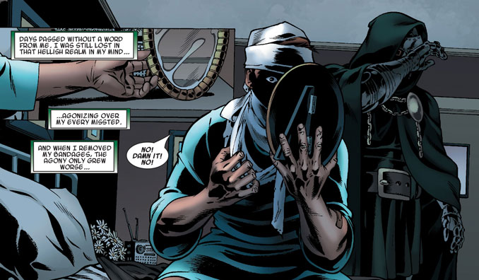 Ed Brubaker choisit une narration risquée mais parfaite : Le Livre de Fatalis est raconté par Fatalis lui-même, à une journaliste venu entendre « la vérité ». Sauf que celle de Victor, bien sûr, est tordue et biaisée. Tout est filtré par son égo démesuré. Sa rencontre avec Reed Richards ? Minimisée. Ses erreurs scientifiques ? Jamais reconnues. Ses débuts dans la magie ? Sublimés. Le récit est alors passionnant parce qu’on lit autant entre les lignes qu’on lit le texte. Parfois, quelques inserts de témoignages d’autres personnages viennent contrebalancer les propos de Victor. Ed Brubaker joue avec l’idée du narrateur le moins fiable du monde, un dictateur persuadé qu’il n’a jamais fauté et que tout n’est que complot ou sabotage. On rit, on grimace, on frissonne. Bref : c’est du Fatalis pur jus.
