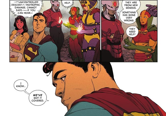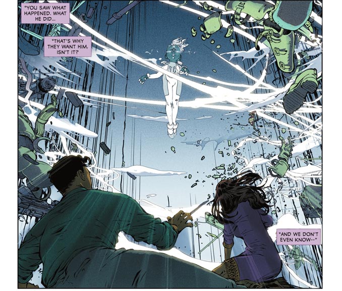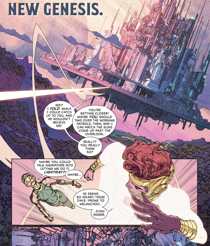 Dès les premières pages, Evan Cagle explose littéralement. Il nous avait déjà impressionné il y a quelques mois sur Dawnrunner. Son style détaillé, énergique, parfois baroque, colle parfaitement à l’univers des New Gods. Ses doubles pages sur New Genesis ou Apokolips sont hallucinantes de beauté, avec ce mélange de modernité et de respect pour la démesure kirbyienne. Clairement, Evan Cagle s’impose comme l’une des révélations graphiques de l’année.
