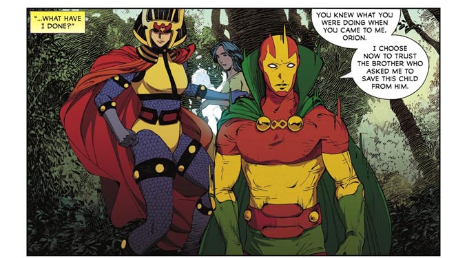 L’intrigue est d’une simplicité redoutable : Darkseid est mort (ou du moins tout le monde le croit) et une prophétie annonce la naissance d’un nouvel enfant-dieu sur Terre, plus précisément le nouveau né de Mister Miracle et Big Barda. Protéger l’enfant ou le tuer ? Le Haut-Père choisit la seconde option, Orion hésite, et Mister Miracle se retrouve à jouer les baby-sitters intergalactiques. Simple, efficace, et dramatique. Bref, du mythe à l’état pur.